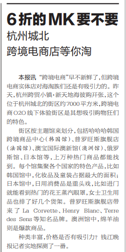 2016年3月2日钱江晚报A08版《杭州首条跨境保税国际街迎客几步路,就能从日本逛到澳洲》一文,报道的正是海彼购国际街区。
